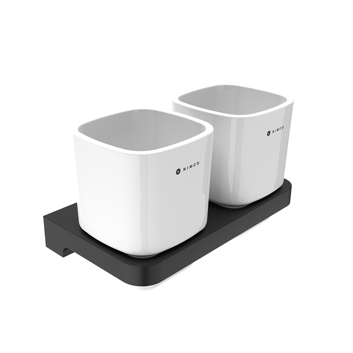 Dvojitý nástěnný držák s pohárky na zubní kartáčky. Keramické pohárky bílé barvy v kombinaci s černým držákem perfektně ladí prostoru u umyvadla. Díky montáži na zeď je údržba povrchu umyvadla mnohem jednodušší. Pro vyladěnou koupelnu doporučujeme i další produkty této designové řady.